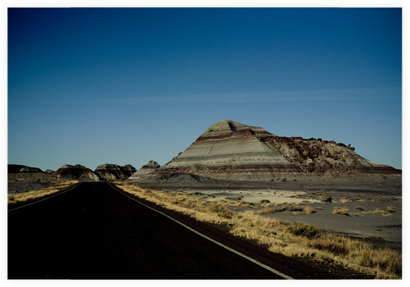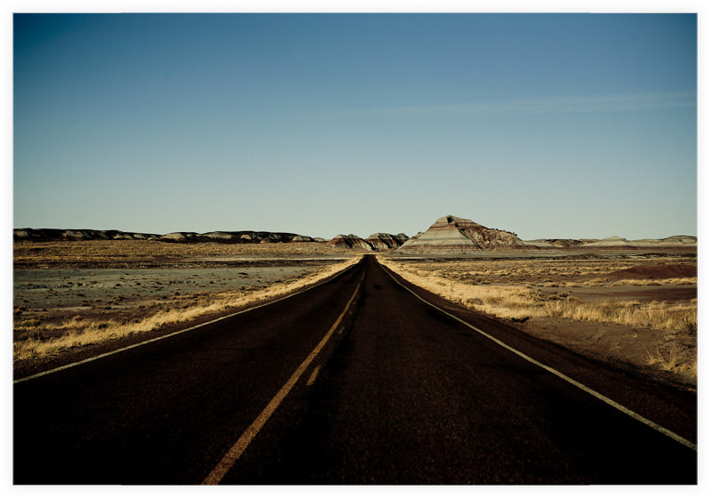 Long stretches of pavement cutting through high desert and layered hills |