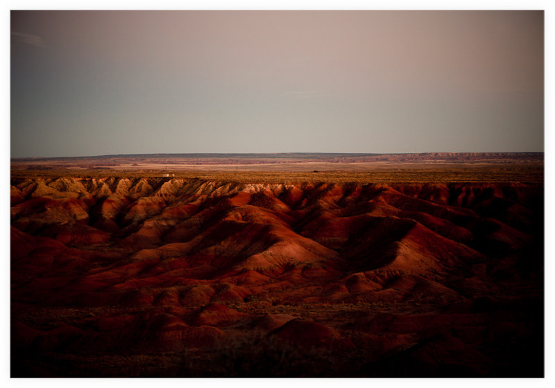 Standing on the edge of the badlands, the hills seem to be painted with the colors of the sunset |