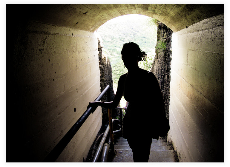 This trail winds over uneven rock, ascends 74 steps, then through a tunnel and up another steep 99 steps. These are the 99. |